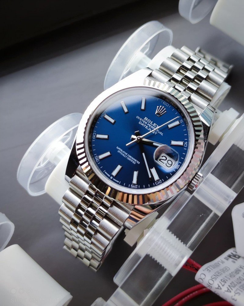 Designed for durability, the Rolex Date Just is water-resistant and equipped with an automatic movement. Whether for casual outings or formal events, the silver blue variant complements any attire effortlessly.